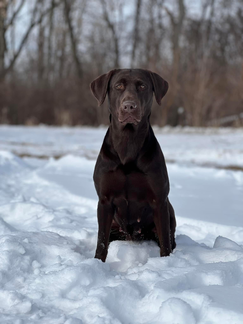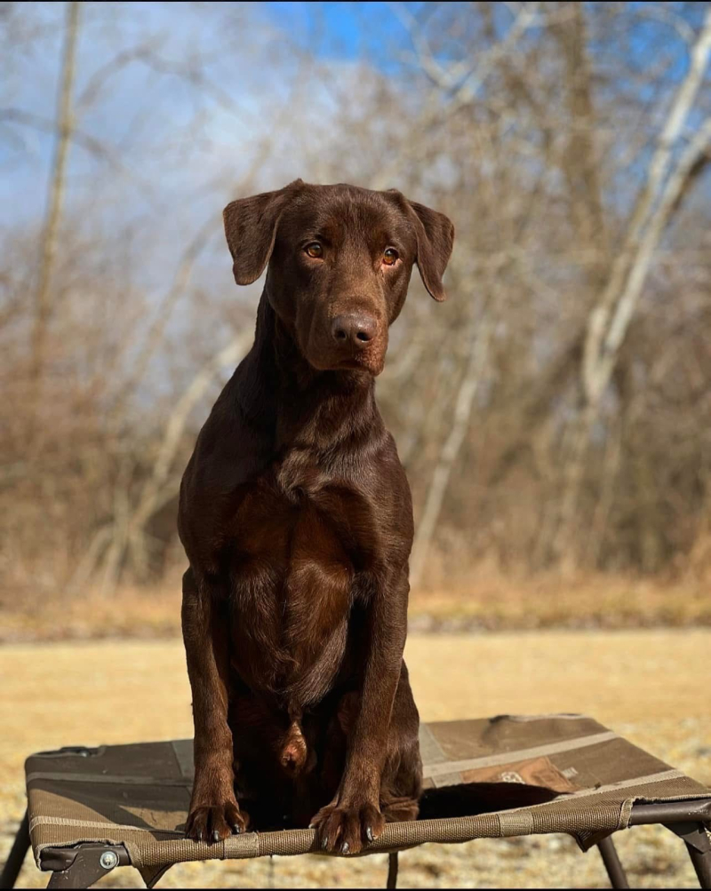 Our trainer and kennel manager Samantha (Sammie) Harms is offering a very nice chocolate Labrador litter due in March 2026. Chief is an AKC Master Hunter and is just a couple passes away from his Hunting Retriever Champion (HRCH) title in HRC tests. He got his first real duck hunting experience this year in North Dakota, and is a full time guide dog at local pheasant preserves here in our area. Chief is a family-centric dog who loves to be with Sammie and thrives when he is involved with his people. He is a 65lbs male that is athletic, but has a nice working dimeanor.
