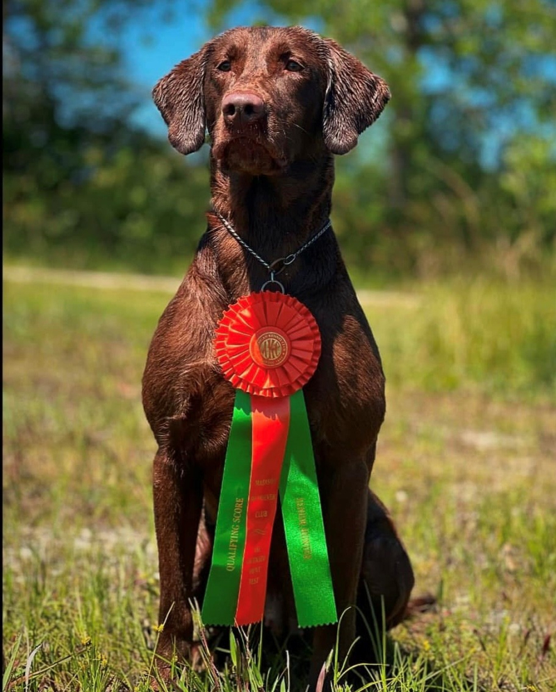 Rip is an AKC Master Hunter with an outstanding pedigree. His sire is FC AFC Carolina's Smoke on the Water ("Little Man"), a 183 all-age point dog! His mother Contender's Stir Crazy, is a daughter of FC AFC Cool Fuel MH. If you are into the Chocolate dogs, this pedigree is fantastic! Tritt is a well-built female that loves the water, loves to retrieve and is a great looking dog. She is around 63lbs and is a joy to train. Tritt is used on our upland guide string at local pheasant preserves, and does have hunt test passes at the seasoned and senior level. She is capable of master/finished level work without question, we simply just do not go to as many events anymore. Tritt is owned by our Kennel Manager, Sammie Harms. Pups will be $2000 Deposit is $500 (non-refundable). No deposit will be cashed until pregnancy is confirmed in mid-April